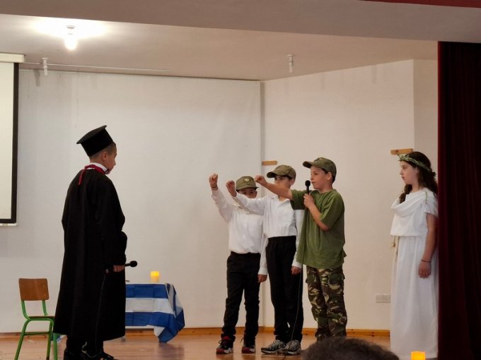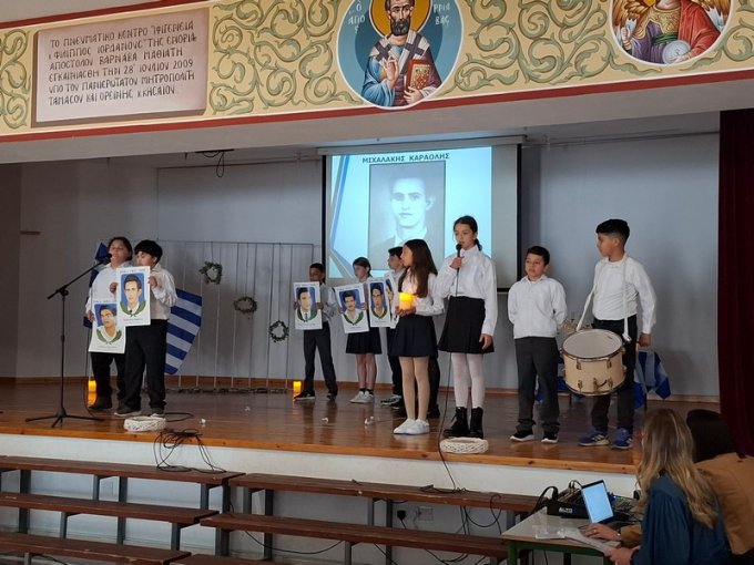 Με λαμπρότητα και σεβασμό στον αγώνα της ΕΟΚΑ πραγματοποιήσαμε ενδοσχολική εκδήλωση στο σχολείο μας για την επέτειο της 1ης Απριλίου. Τα παιδιά της Α',Β' και E' τάξης υποδύθηκαν ρόλους και έδωσαν τιμή στους ήρωες του αγώνα. Η χορωδία του σχολείου μας τραγούδησε τα τραγούδια: