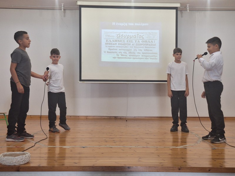 Στις 27 Οκτωβρίου 2022 τα παιδιά της Δ', Ε' και Στ' τάξης παρουσίασαν προς τους συμμαθητές και τους δασκάλους του νηπιαγωγείου και του σχολείου μας ένα αφιέρωμα στην επέτειο της 28ης Οκτωβρίου 1940. Η εκδήλωση περιλάμβανε αφηγήσεις,ποιήματα και δρώμενα σχετικά με τα γεγονότα της ιταλικής και της γερμανικής επίθεσης και κατοχής, τραγούδια και χορούς.