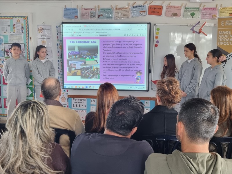 Στο σχολείο μας πραγματοποιήθηκε επίσκεψη από το Κυπριακό Κέντρο Ασφαλούς Διαδικτύου CYberSafety, το οποίο πραγματοποίησε διάλεξη με στόχο την ενημέρωση και ευαισθητοποίηση των μαθητών για την ασφαλή και υπεύθυνη χρήση του διαδικτύου. Οι εκπρόσωποι ενημέρωσαν τα παιδιά για βασικούς κανόνες πλοήγησης, τον διαδικτυακό εκφοβισμό, την παραπληροφόρηση, τους κωδικούς ασφαλείας και τον χρόνο που είναι σωστό να αφιερώνουν στις οθόνες. Επιπλέον, τα παιδιά γνώρισαν τη σημασία των διαδικτυακών μέσων κοινωνικής δικτύωσης και τα βασικά σύμβολα που συναντούν στο διαδίκτυο, ώστε να αναπτύξουν υπεύθυνες, κριτικές και ασφαλείς ψηφιακές συνήθειες. Παράλληλα με τη διάλεξη έγινε σύνδεση με το Δημοτικό Σχολείο Κάμπου ώστε να γίνει γνωριμία με τα παιδιά αλλά και να παρακολουθήσουν και τα ίδια την παρουσίαση στα πλαίσια της δικτύωσης και συνεργασίας των σχολείων.